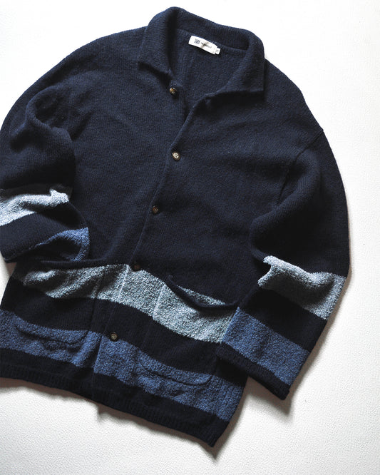 90s Striped Navy Blue Collared Button Up Sweater Cardigan (M)