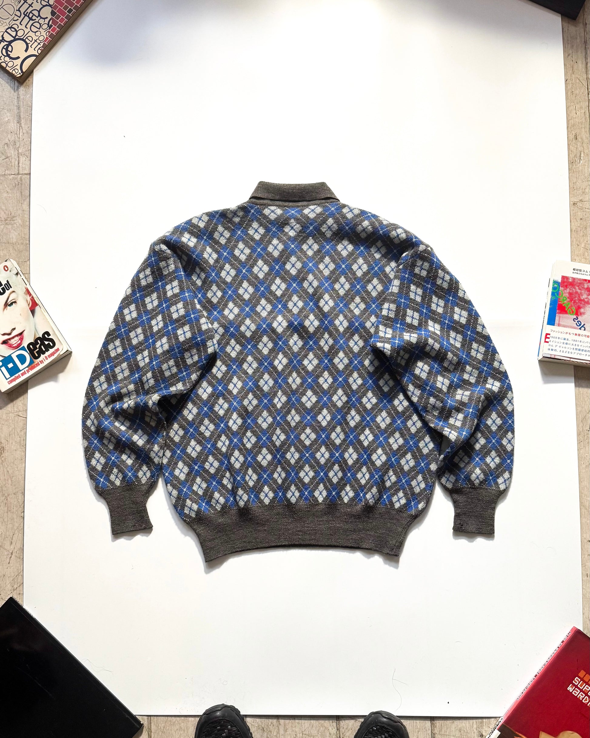 90s Blue / Grey Argyle Pattern Quarter Button Collared Knit Jumper (M~L)
