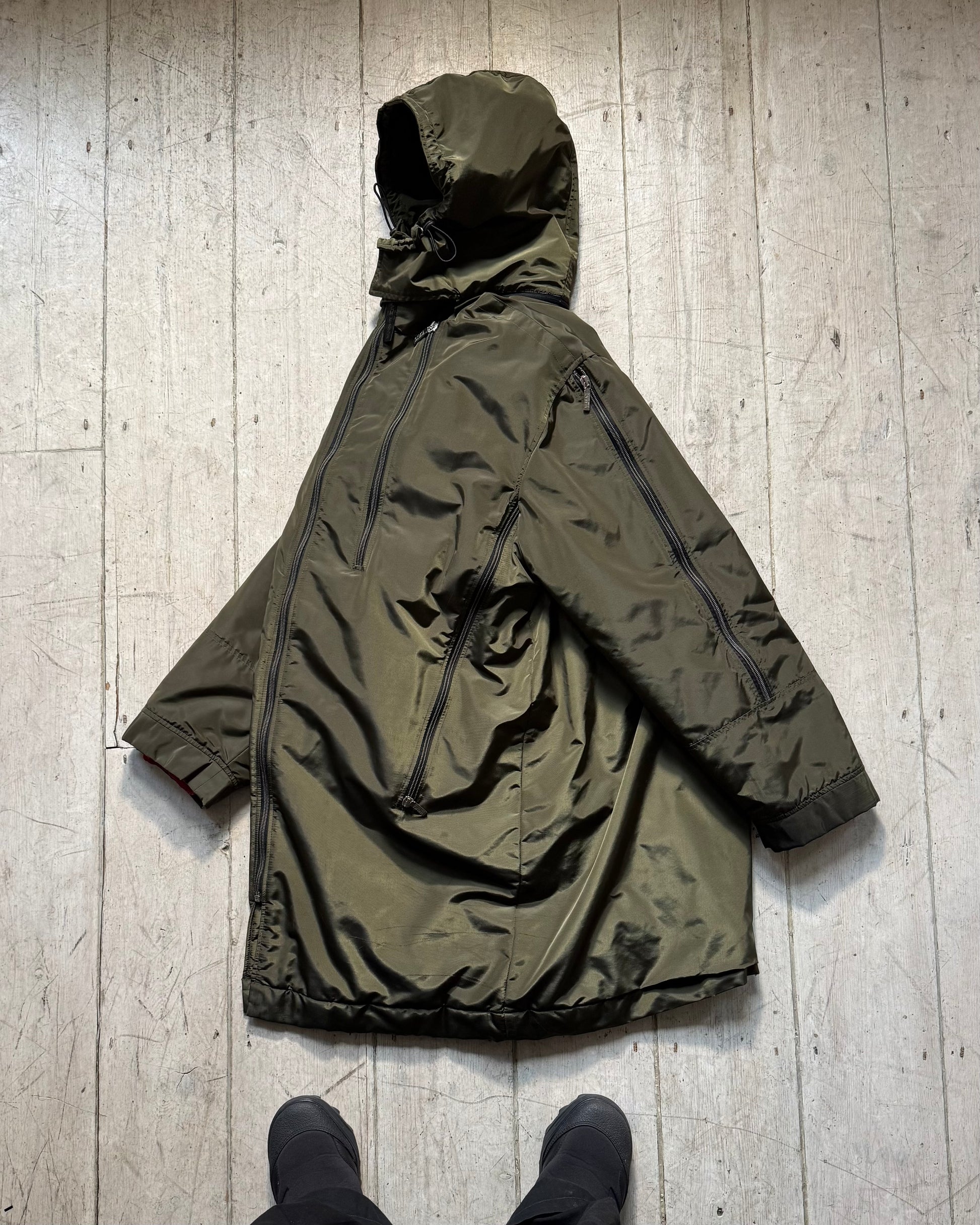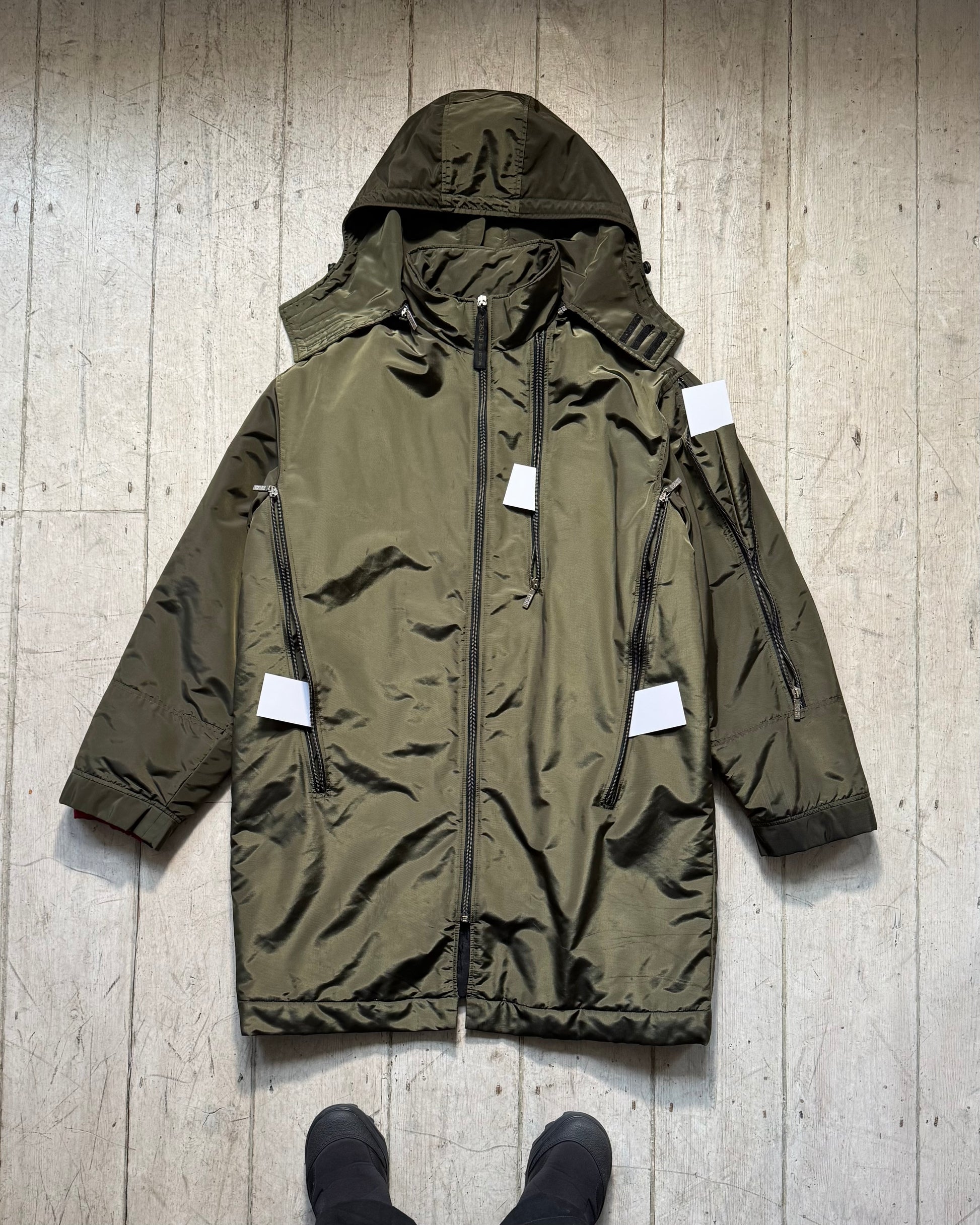 Versace Vintage Iridescent Olive Green Asymmetrical Multi Zip Long Coat / Jacket (L)