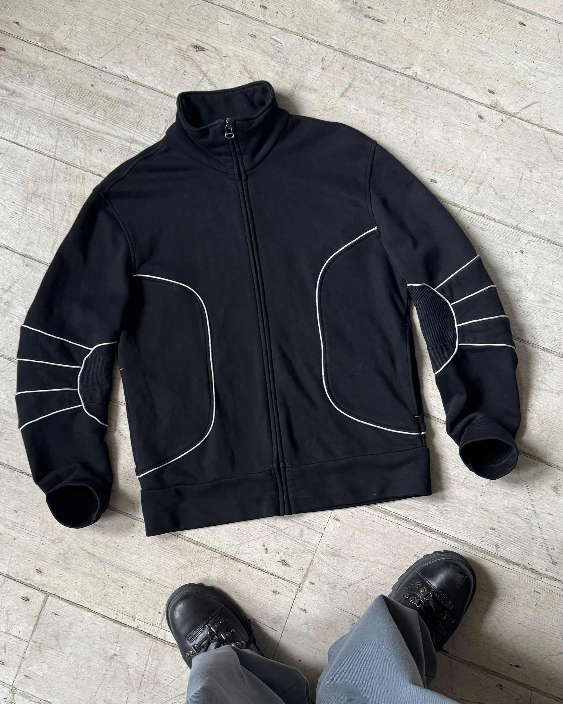 Hugo Boss 2000s Black White Moto Style Piped / Ribbed Articulated Elbow Zip Up Tracktop (~M~)