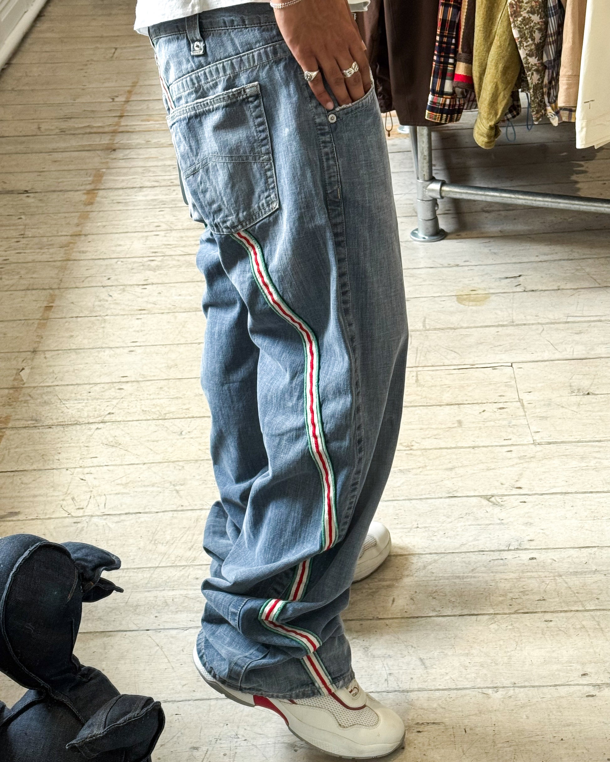 Early 2000s Red/Green Striped Wrap Around Jeans (30 + 36 + 38 )