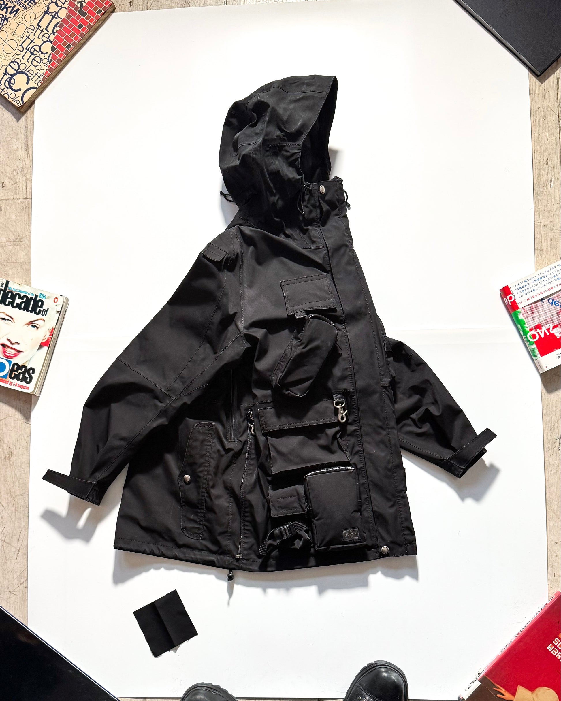 - Lovely bit of design from Junya as he meticulously combines compartments and widgets found on porter bags onto a jacket but this jacket is just an amalgamation of so many pockets from different worlds like how has he combined a hunting style pockets on the back to a neat built in wallet like who needs that? Someone who is prepared for everything I guess