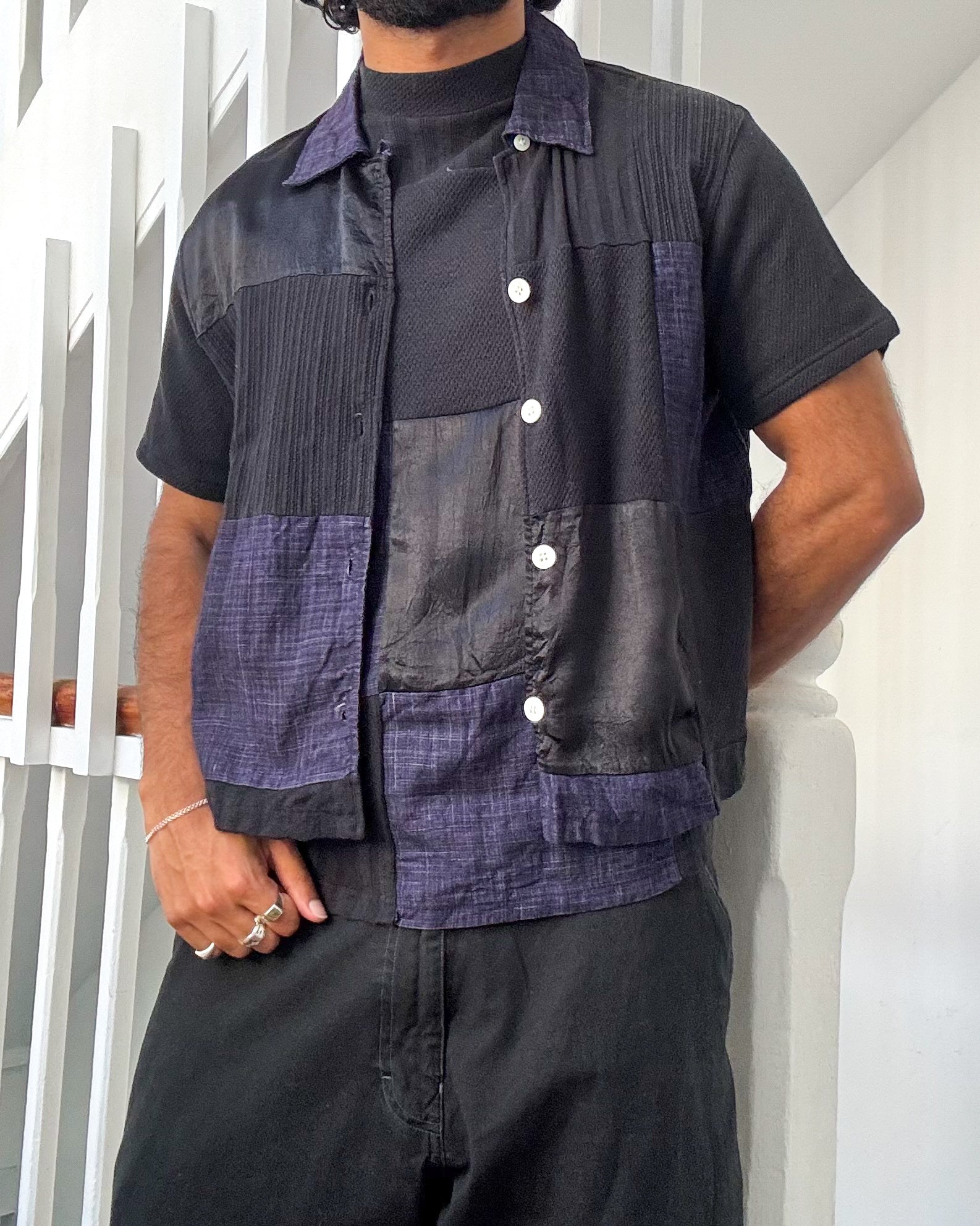 Patchwork Black Blue Shirt and Tshirt Set (~S~)